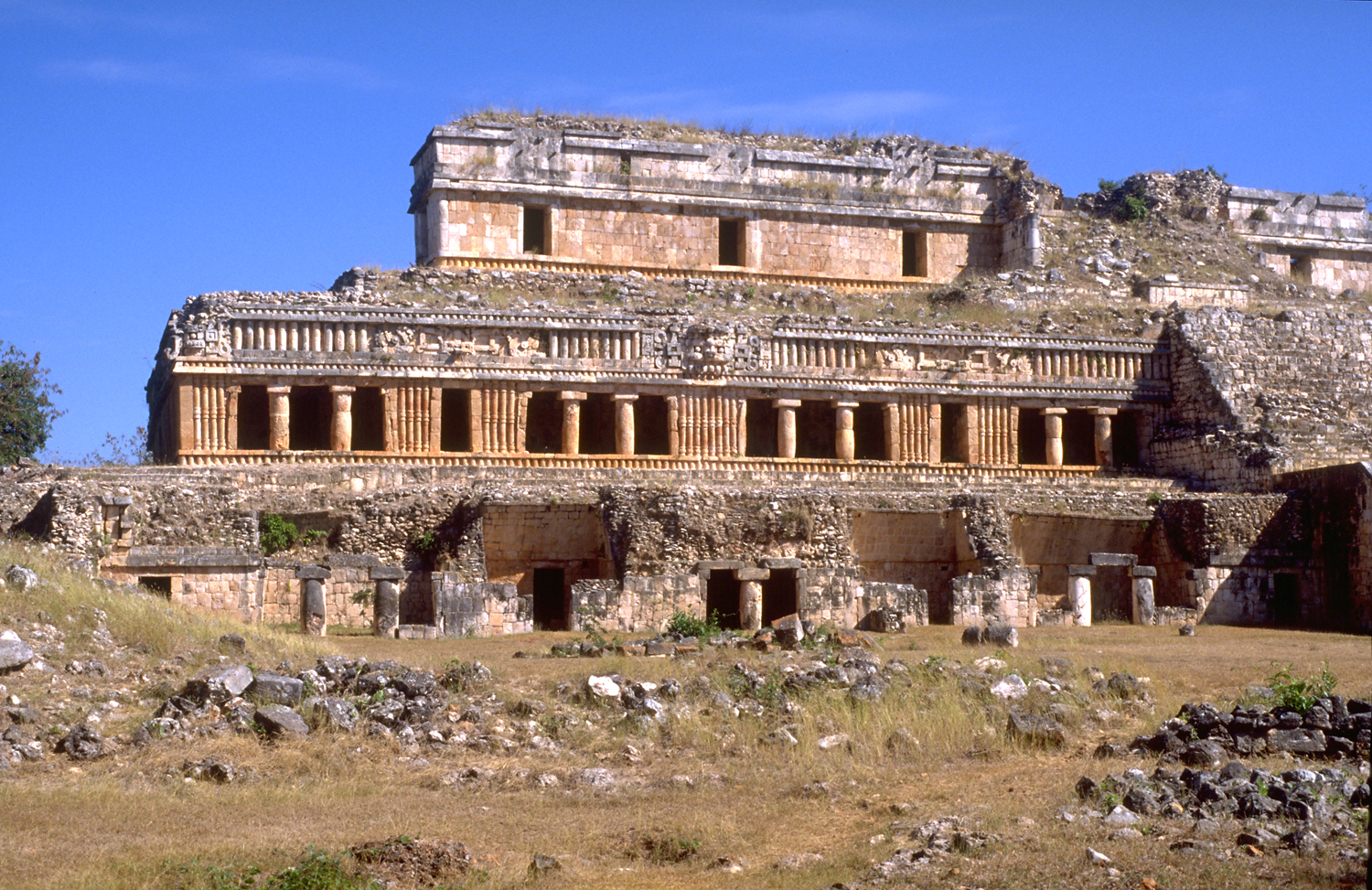 This facade is one of the most admired designs in Maya architecture, a highly original composition. The mid-level is composed of four two-column doorways and two narrow doorways leading to interior staircases, interspersed with colonnettes of spool-banded half columns.       Jan. 2003 (24mm lens)