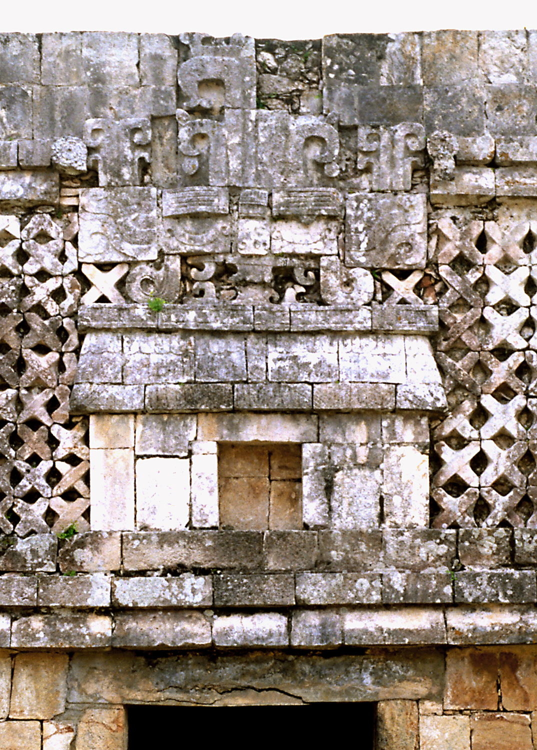 Uxmal, Nunnery, South Building. Over 3rd doorway from left. A small representation of a traditional Yucatec thatched building, crowned by mask and sprouting vegetation.       Jan. 2001