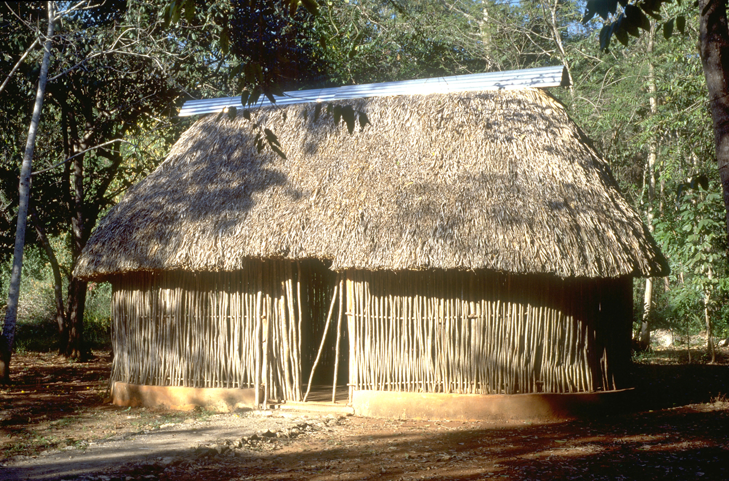 Labná. Front of characteristic Yucatec Maya thatched domestic hut; main structural framework inside; concrete rubble foundation, walls of vertical poles and sticks, palm thatch roof, modern metal ridge covering.       Jan. 2001