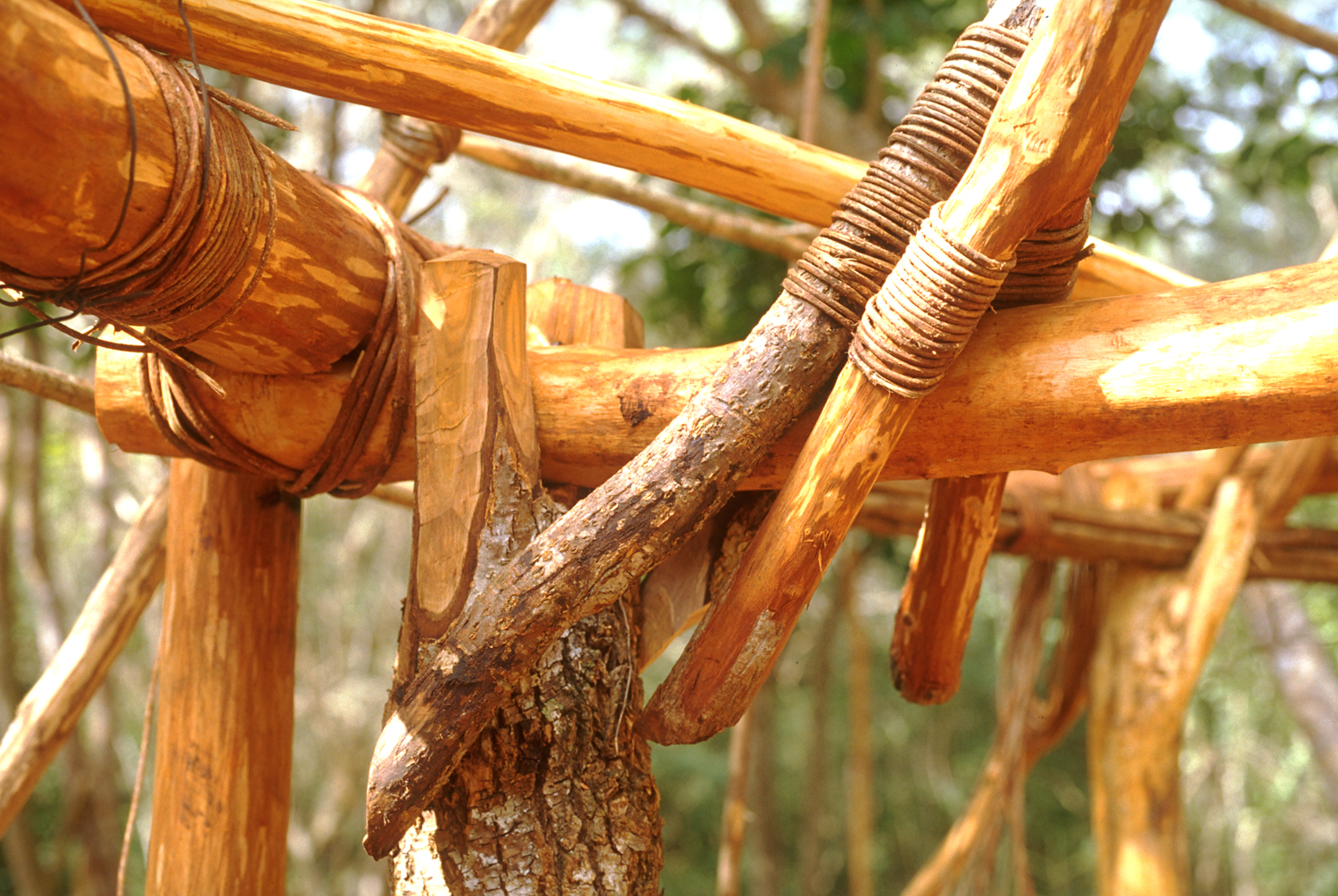 Same building. Detail of construction, showing notched top of mainpost to hold main crossbeam, which supports natural forks of A-frame poles; showing lashing together of poles, rods, etc., using local vines.       Jan. 2002