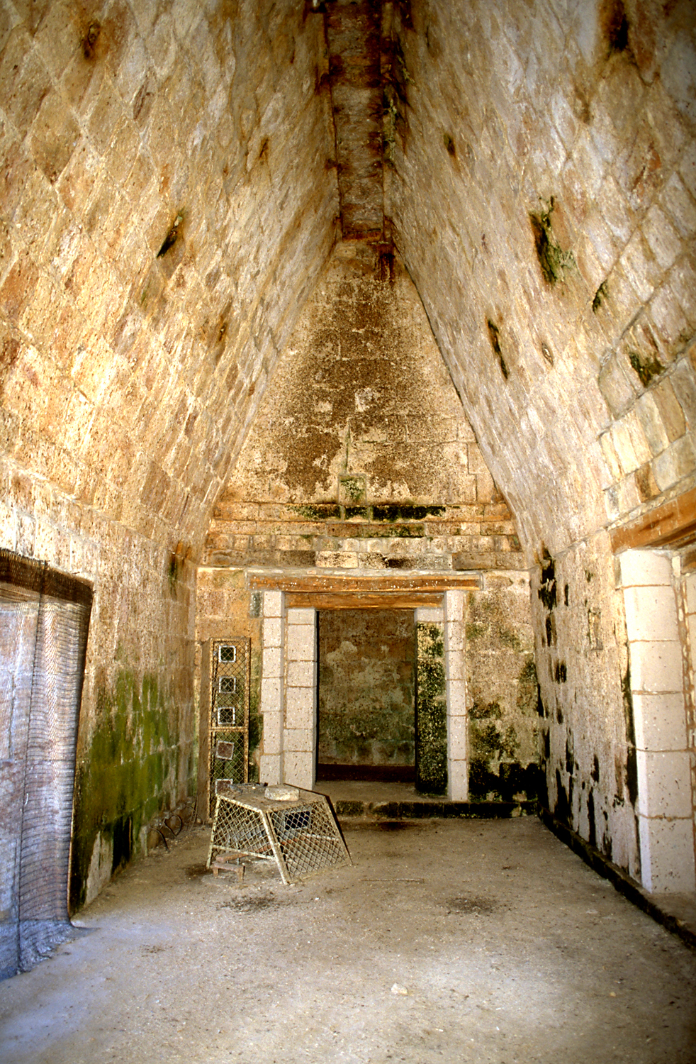 2003. Same view as in 1843 print at left. The relatively straight vault shape is unusual for Puuc interiors, but common in major Uxmal buildings.
