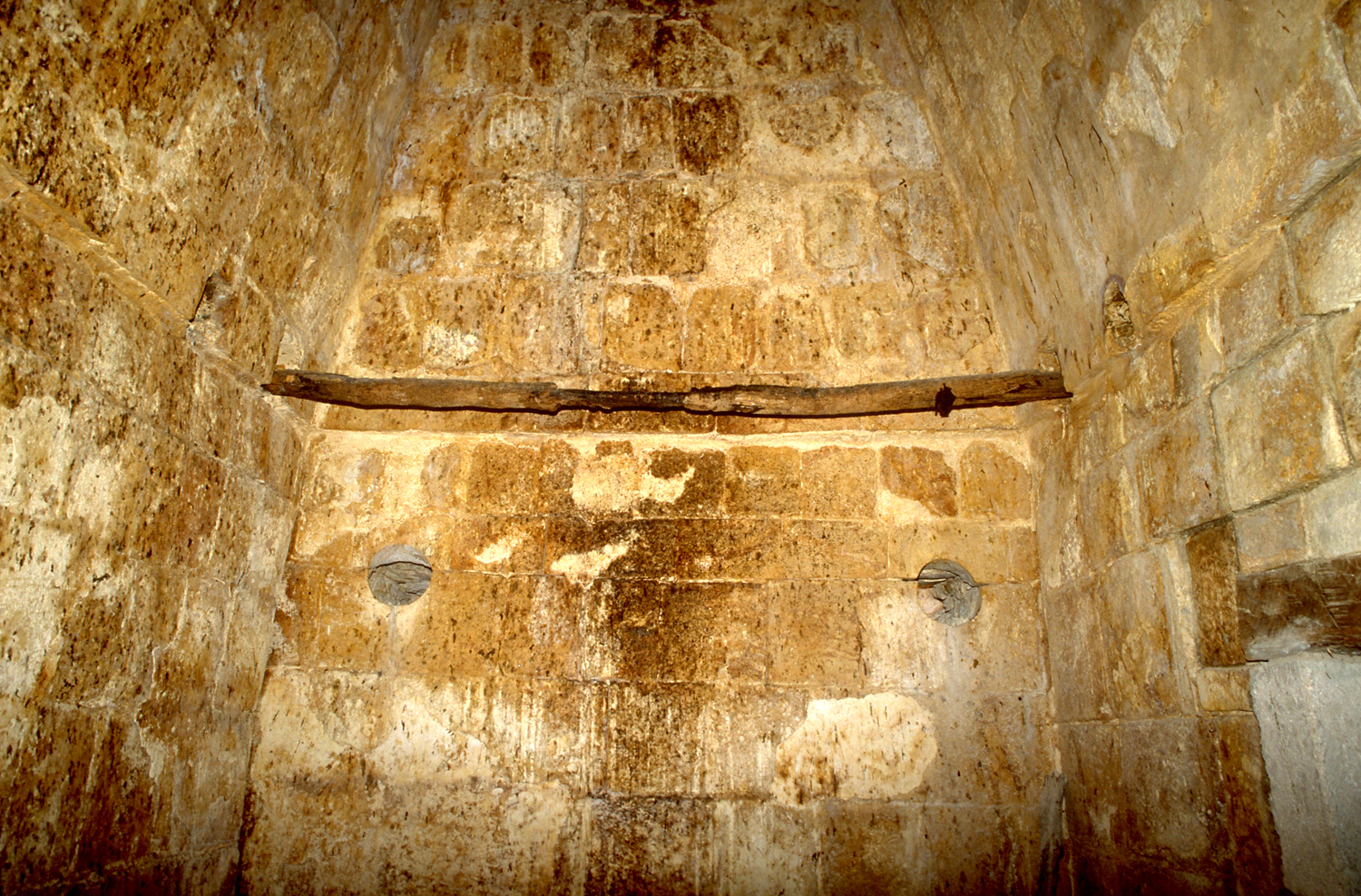 Detail of area in photo at left, showing crosspole with its ends in wall depressions; below seem to be circular airvents filled in with lime concrete to discourage bats and swallows.