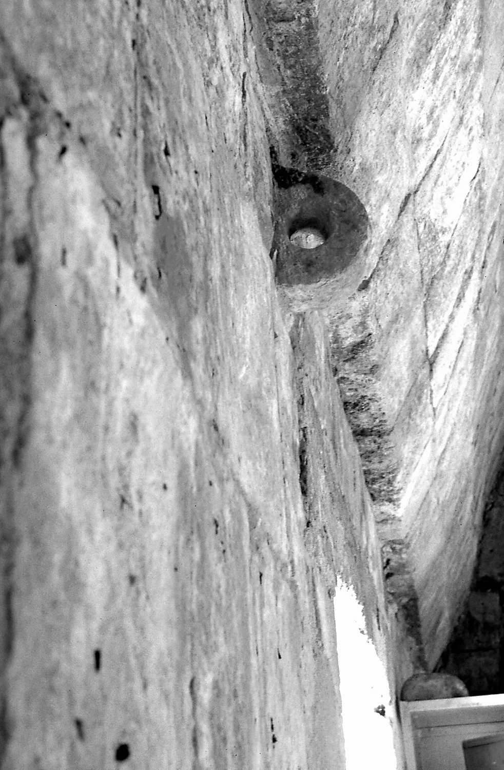 Wall beside door with typical cordholder. Cordholders were located just below springing of vaults, beside doorways, to hold poles or ropes, from which curtains could be hung.       Jan. 2001