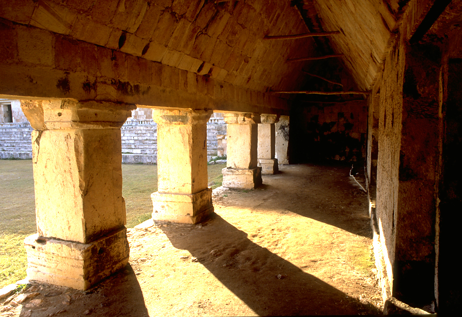 Building at left of grand staircase, known as "The Temple of Venus", front room; looking west, showing all 4 square piers. Main shafts are not carved on sides or back.