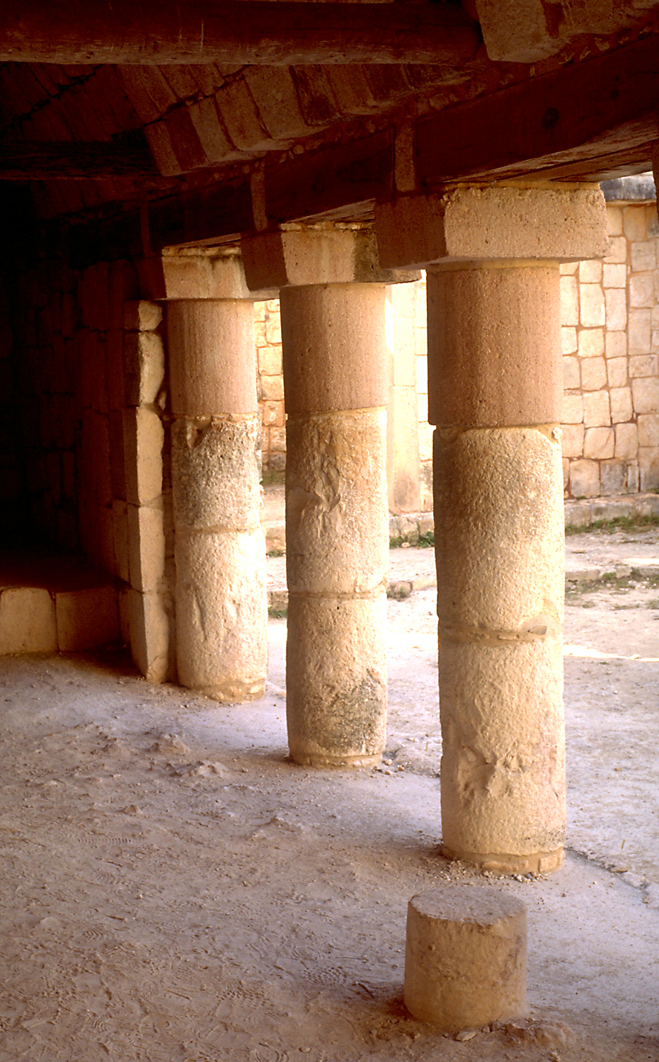 Last three columns at west end, new replacement stones above are distinguished from original (replaced) stones below.    Jan. 2003 (24mm lens)