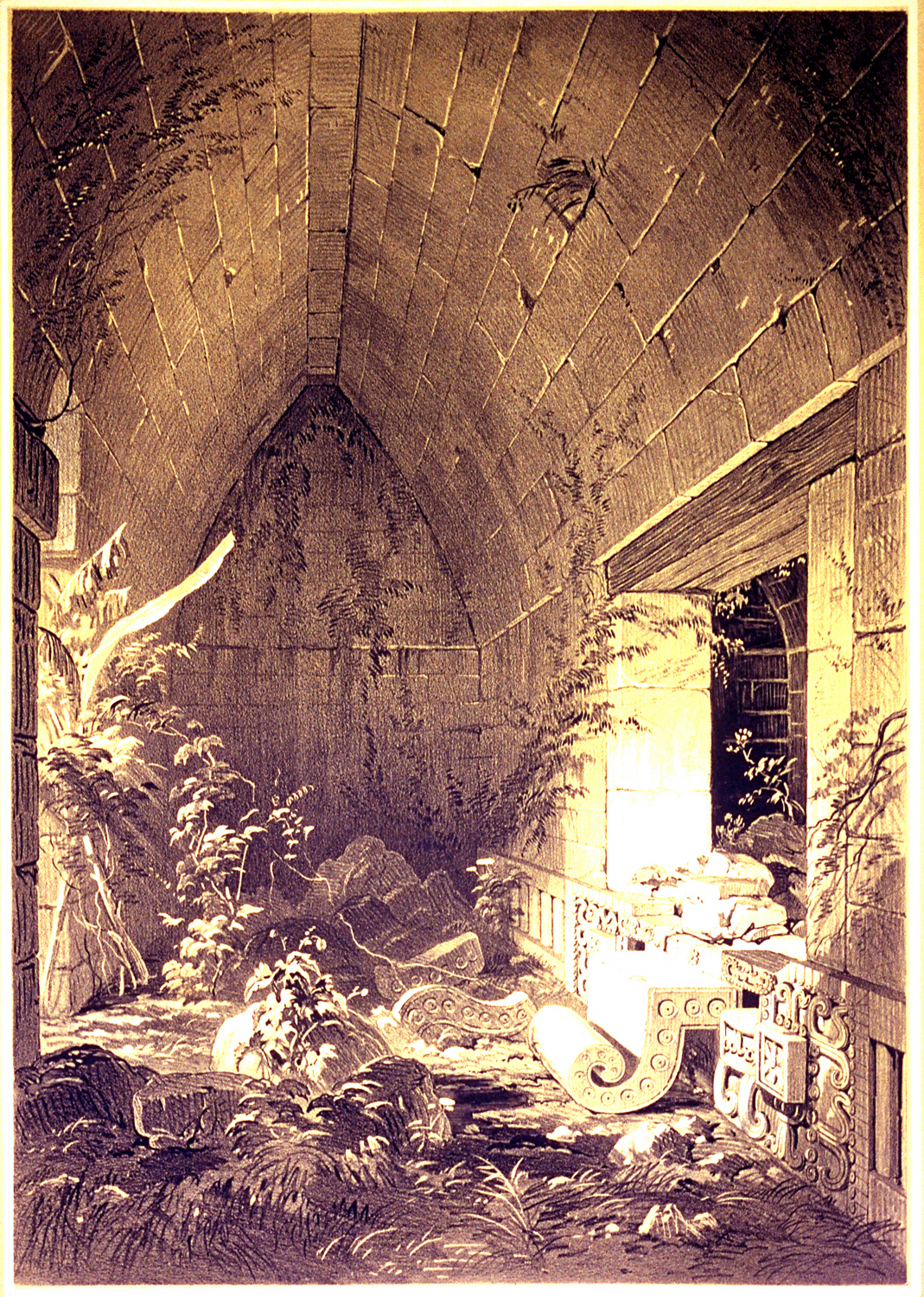 Aquatint in Frederick Catherwood, Views of Ancient Monuments in Central America, Chiapas, and Yucatan, 1844 (Pl. XVI). This image scanned from a 35mm slide taken from a copy in the AMNH (RF-13-K). Reproduced Courtesy of The Division of Anthropology, American Museum of Natural History.