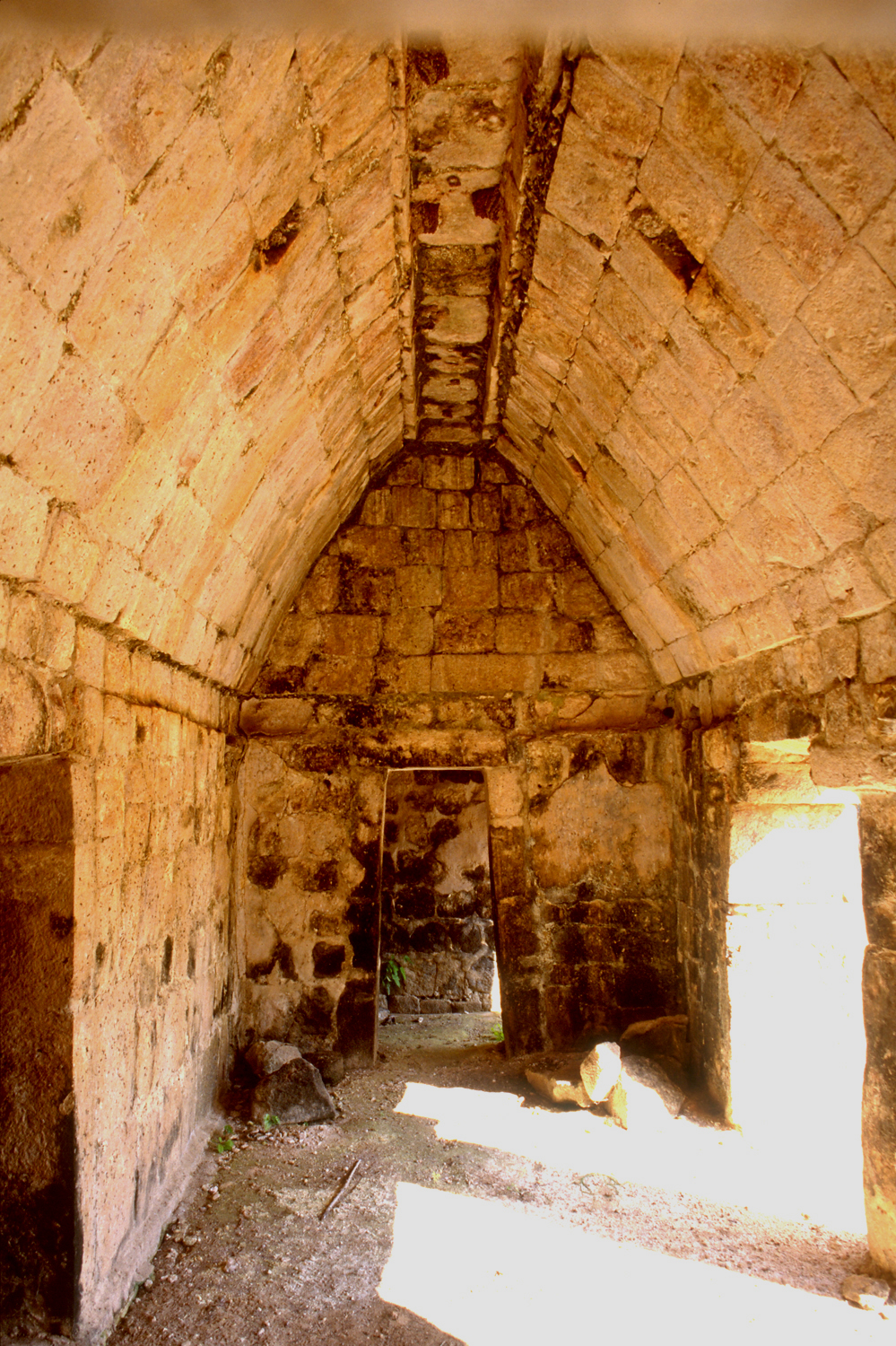 Sayil, Great Palace, Mid-Level, Interior of room farthest left. Looking through narrow end door to room with staircase; visible beam holes near top.        Jan. 2003 (24mm lens)