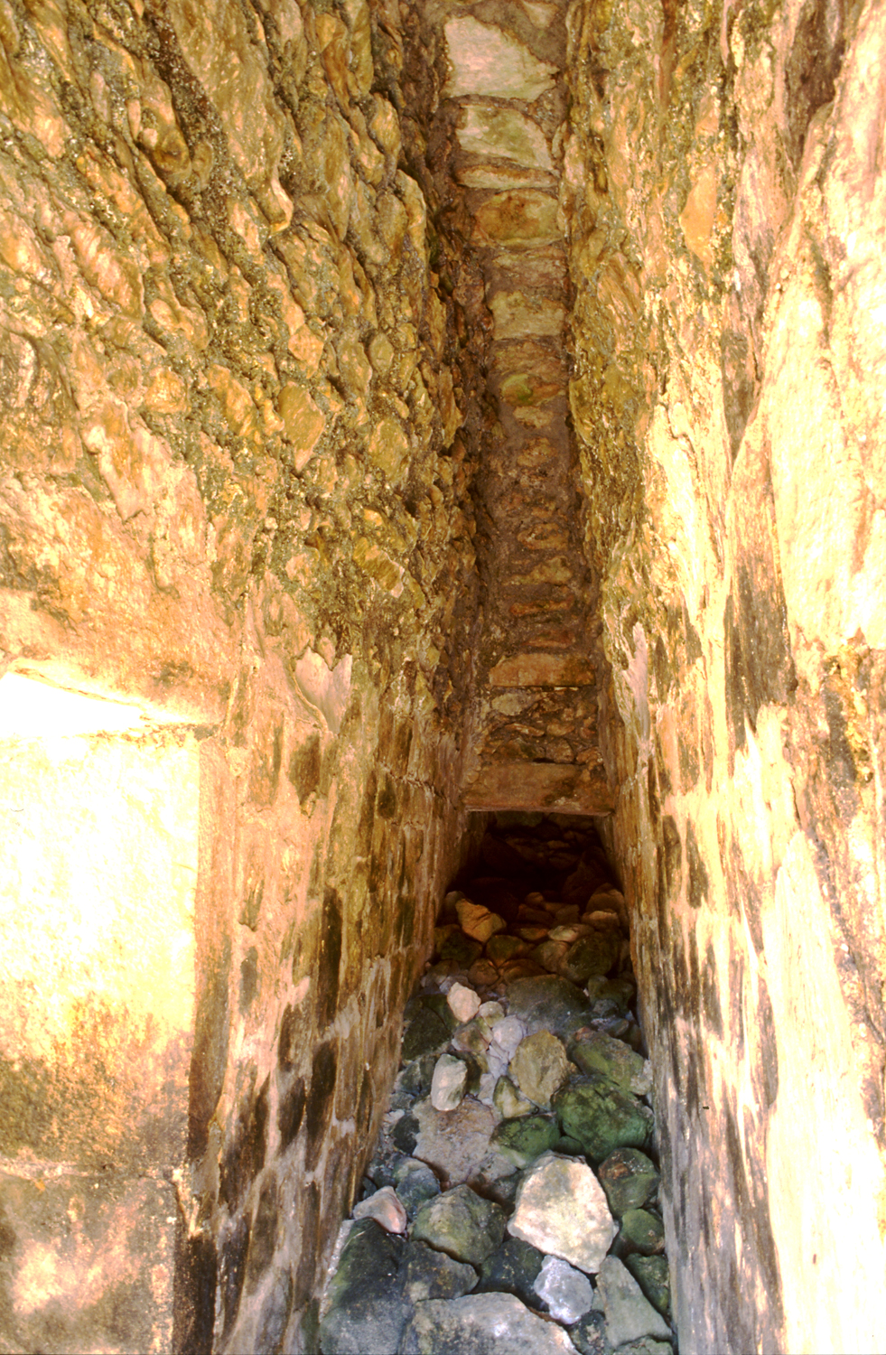Narrow room with collapsed interior staircase, seen through door in photos at left. Looking north to vault and collapsed staircase below.