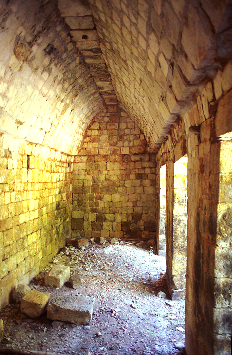 Structure 2C4. 3-doorway room, showing slight projection and curving underside of soffit and plaster remains.