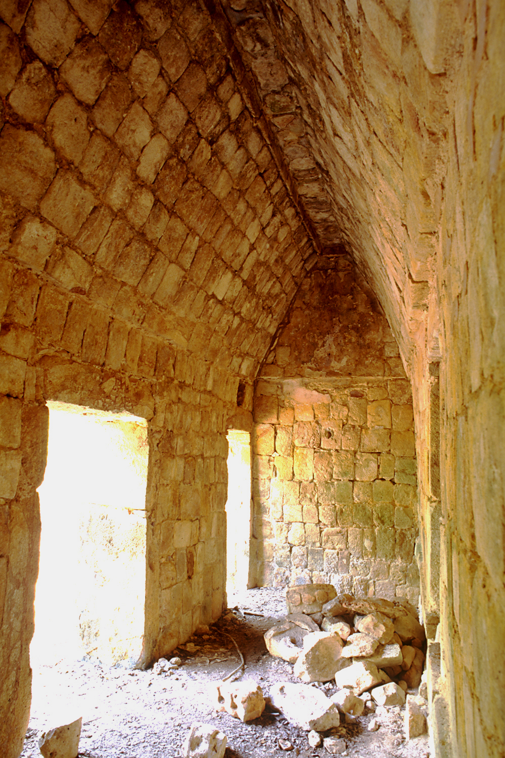 Sayil, South Palace. Central room of front range; at left are 2 of doorways from outside.       Jan. 2003 (24mm lens, flash)