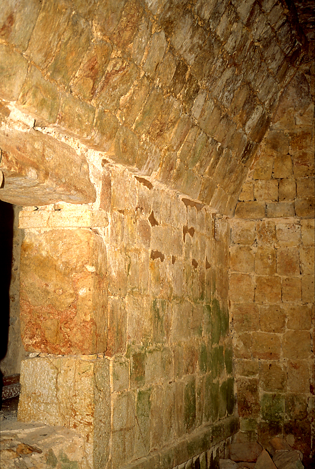 Back wall of central room, showing raised doorway into back room; full width jamb stones, small corbel, large lintel, and bits of painted plaster remains.            Jan. 2001 (flash)