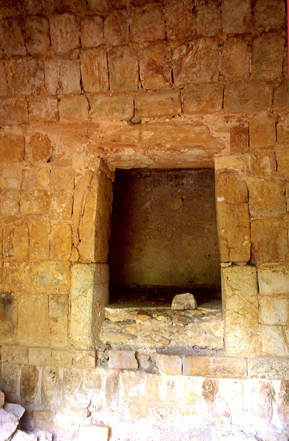 Back wall of central room with raised doorway and step into back room, base molding with colonnette below.