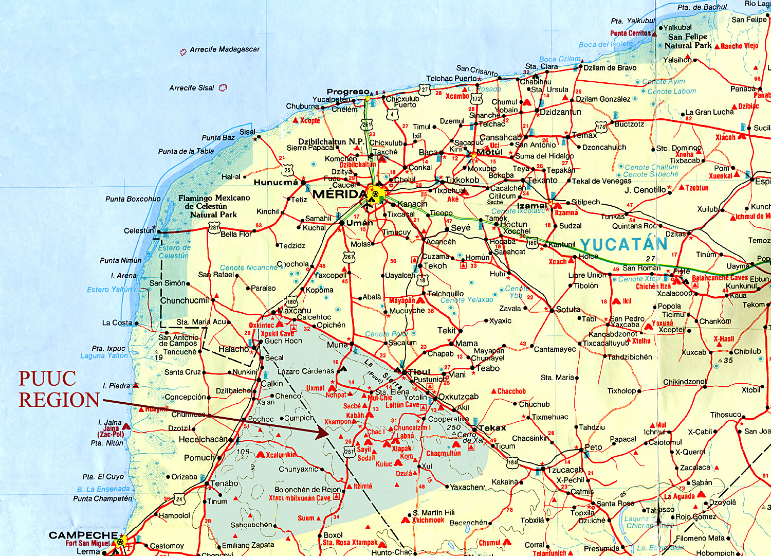 Northwest Yucatán Peninsula, showing modern cities and road, with Maya archaeological sites in red.
