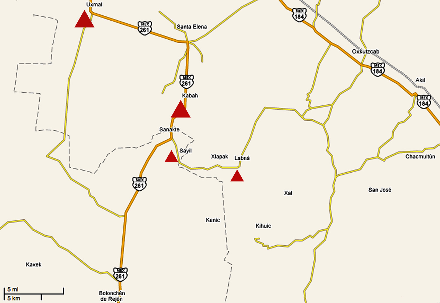 The central Puuc Region, showing locations of Uxmal, Kabah, Sayil, and Labná and current highways.