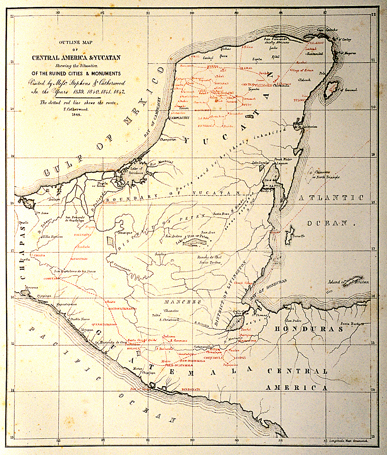 1844. Catherwood. "Outline Map of Central America & Yucatan, Shewing the Situation of the Ruined Cities & Monuments Visited by Messrs. Stephens & Catherwood. In the Years 1839, 1840, 1841, 1842. The dotted red line shews the route. F. Catherood. 1844."