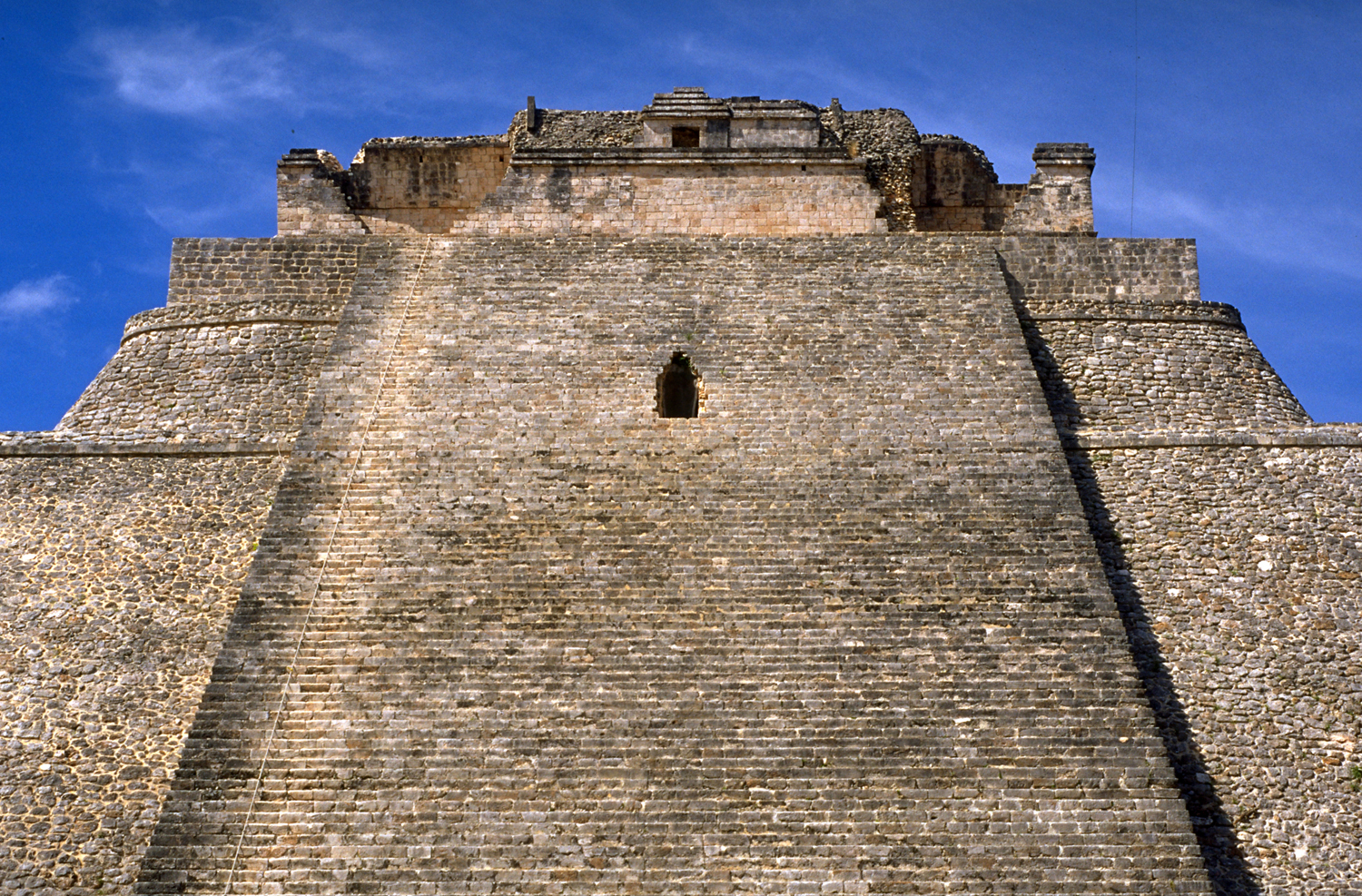 East front, with tall, exceptionally wide staircase. Hole near top of staircase dug by archaologists to study temple 2 inside, which had been entirely covered by later construction.            Jan. 2001