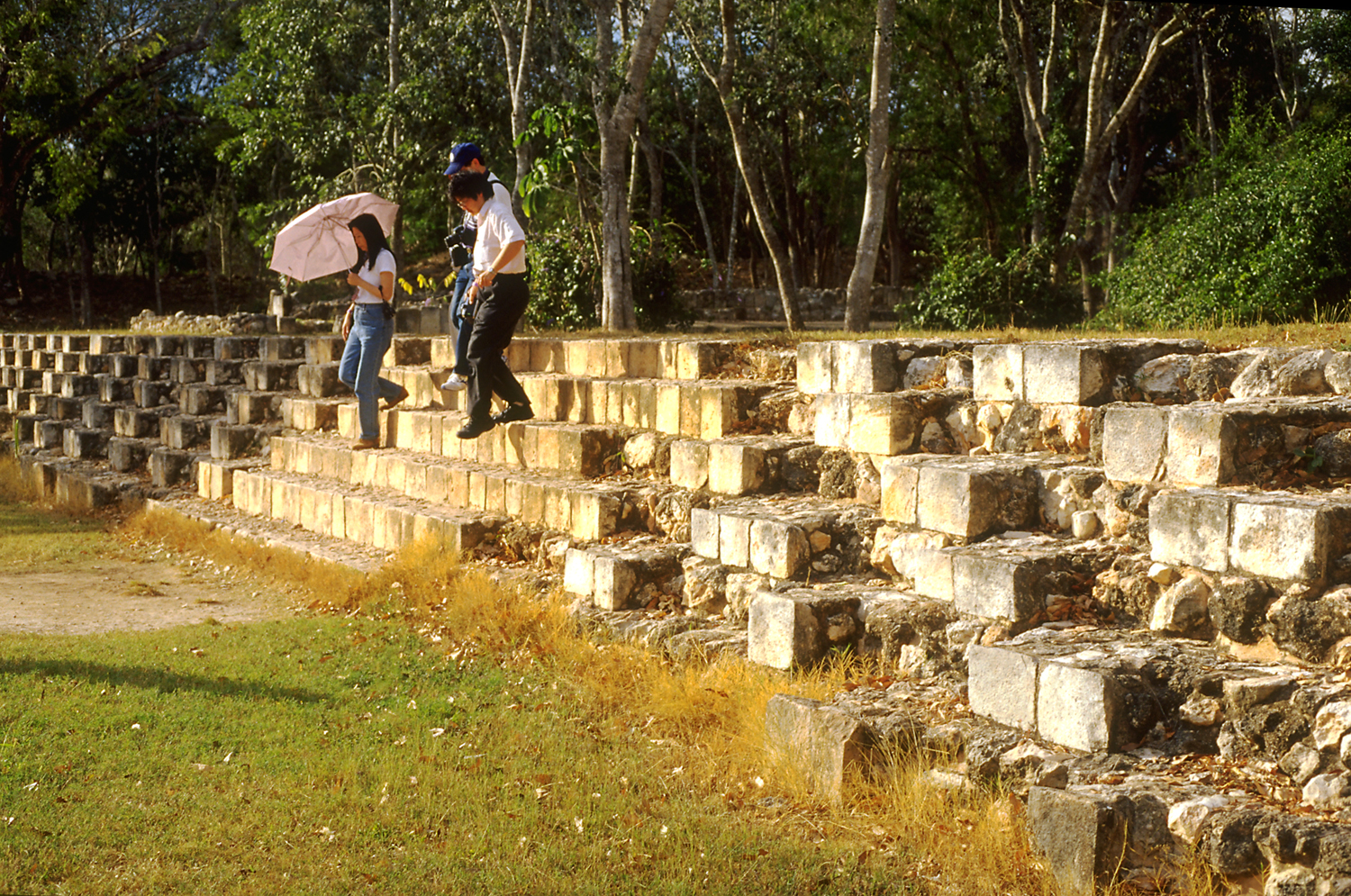 Low staircase from from plaza and ballcourt area up to large terrace. As often, the central portions of staircase have been restored for tourists. Areas at the sides restored only to indicate central the extent and form of original staircase.          Jan. 2001