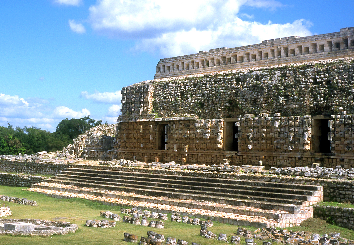 Front (south) facade of Codz Poop. Main Staircase leading up from large terrace on top of Codz Poop Platform to shallow terrace in front of building. Staircase completely restored 1953.       Nov. 1999