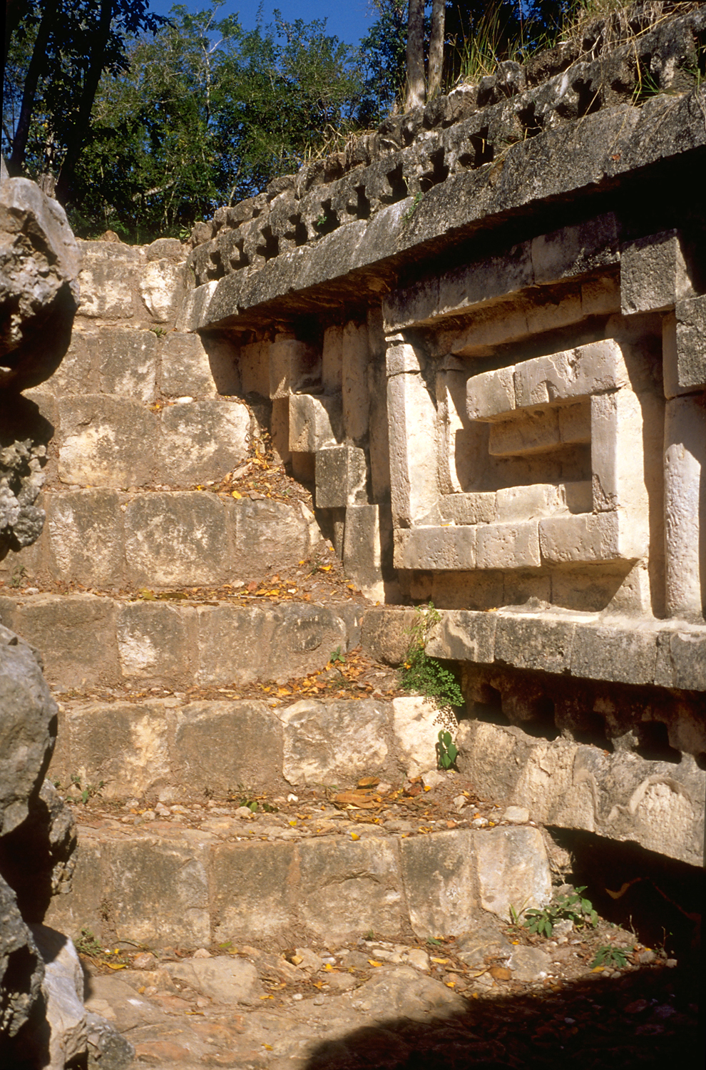 Upper flight of staircase, fret motif at right.       Jan. 2002