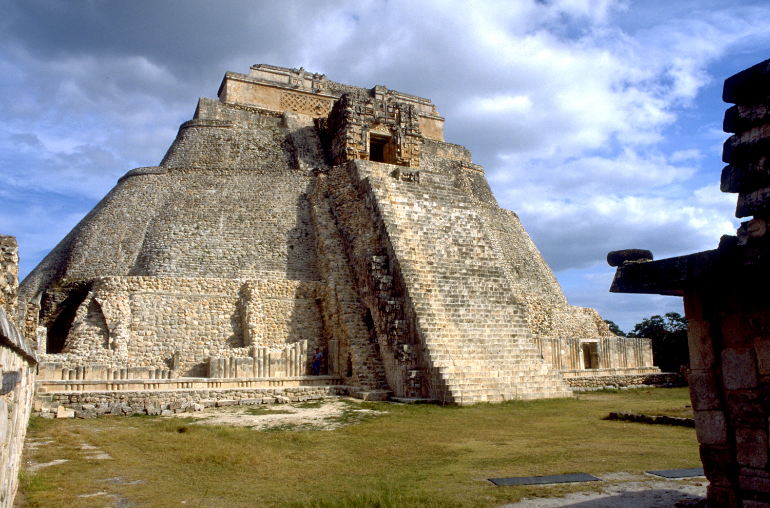 Northwest corner of Pyramid of the Magician, with the steepest staircase at Uxmal. It is thought that victims were sacrificed in front of the temple mouth and their bodies tumbled down the stairs.      Jan. 2003 (24mm lens)