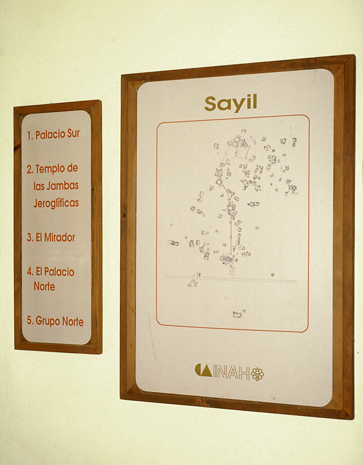 Map of civic-ceremonial center of Sayil. A causeway (not shown) connected Sayil to a separate city, Chac II, 1.7 km. to NW.       Jan. 2001