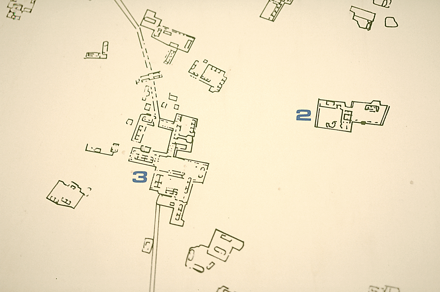 Ground plan of Pyramid Temple (El Mirador) and Temple of Hieroglyphic Doorway; detail of map at left.      Jan. 2002