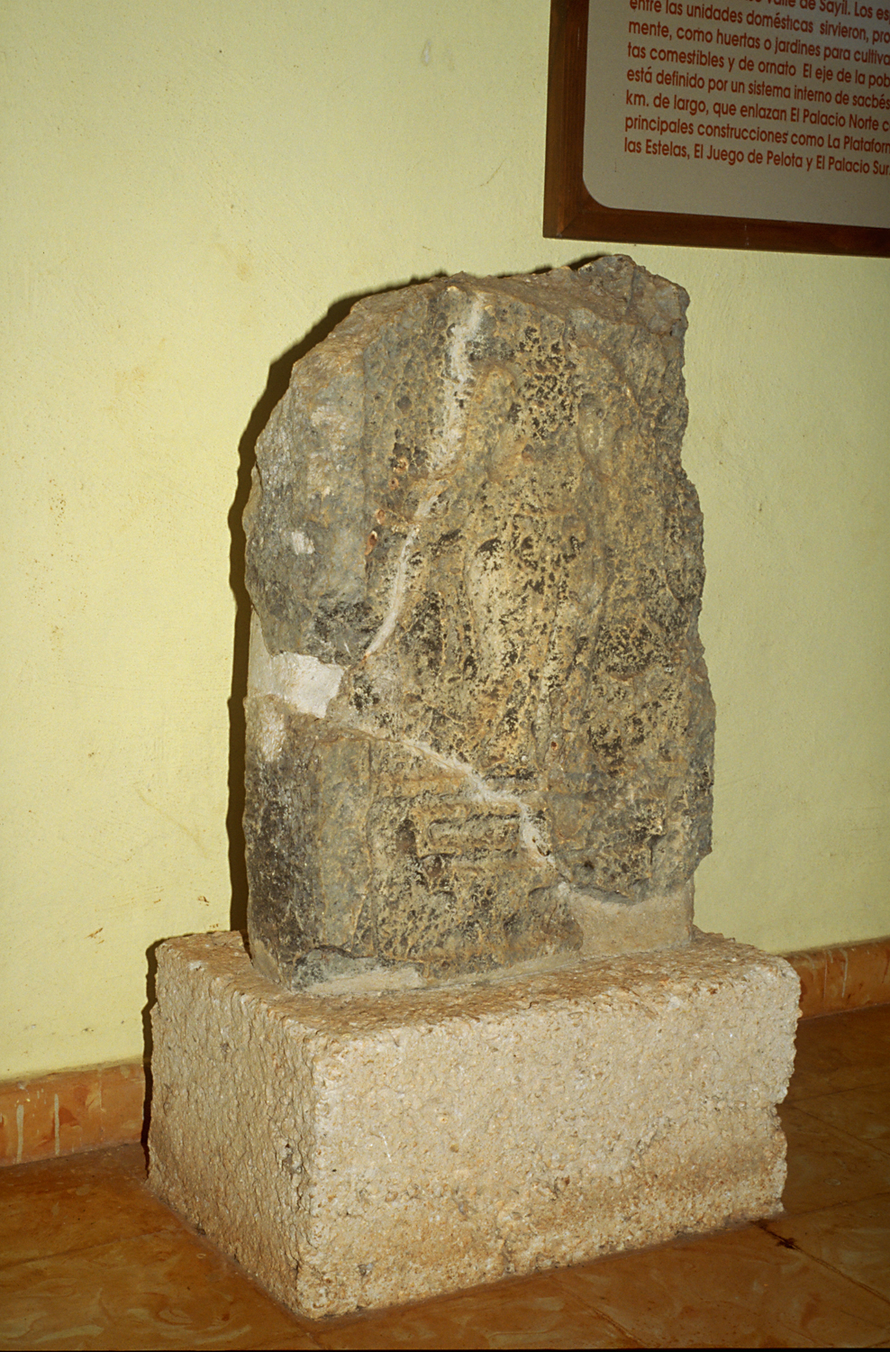 Upright stone with carving on front surface.       Jan. 2001 (flash)
