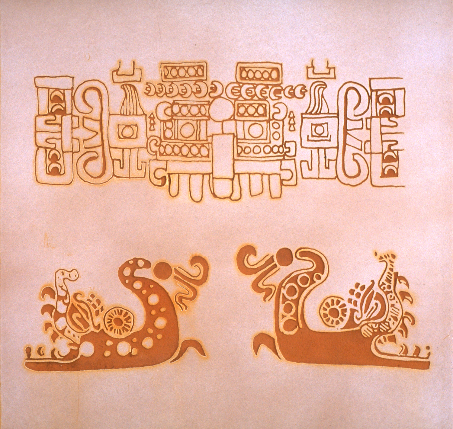 Detail of plaque at left; drawing of central mask and of serpents flanking diving god on main facade.       Jan. 2003