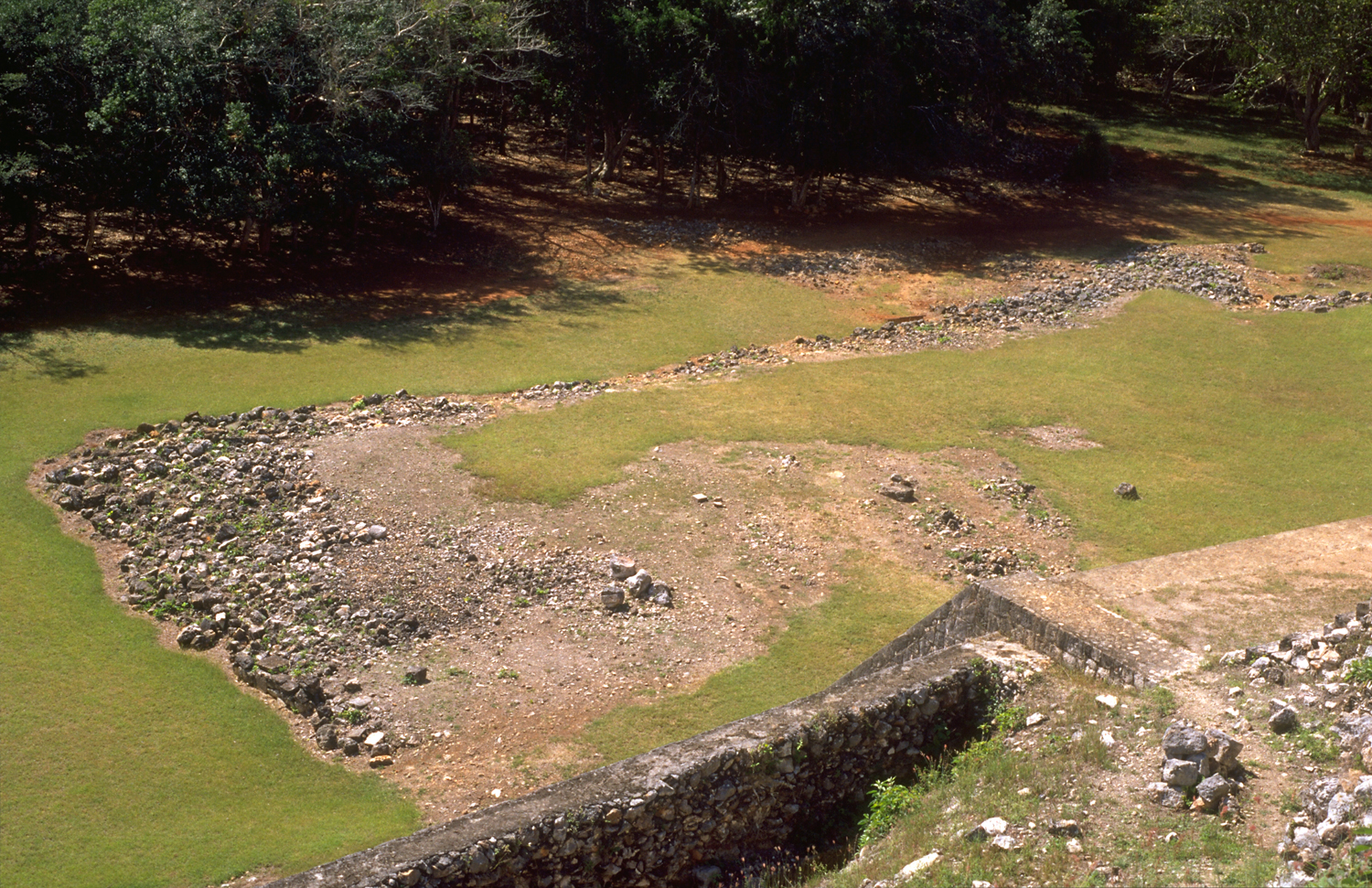 Looking down on remains of low platform in front of Palace, broken altar in front of staircase.      Jan. 2002
