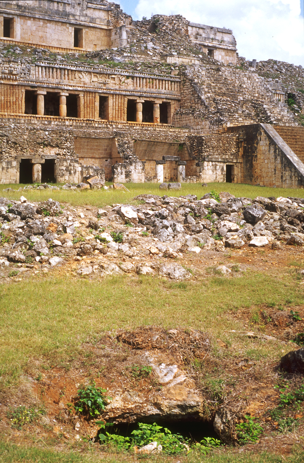 Mouths of two chultunes in front of edge of platform.       Jan. 2002