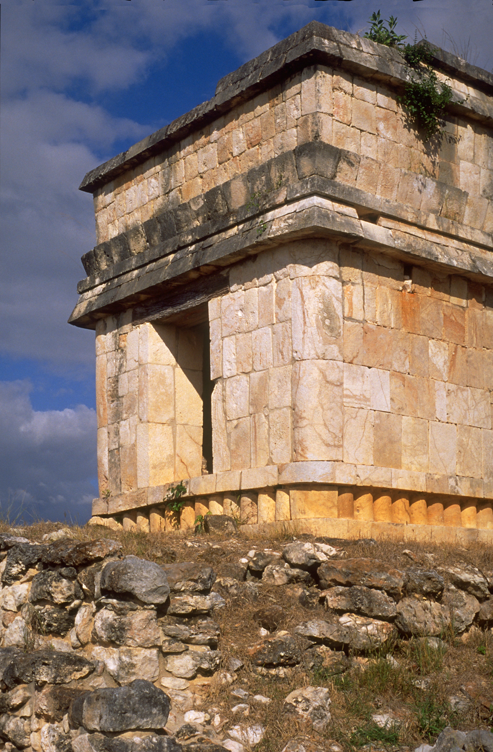 West end of narrow upper level, with special features: curved corner stones; refined, six-stone, double depth stone jambs, restored; and modern wooden lintel.       Jan. 2001