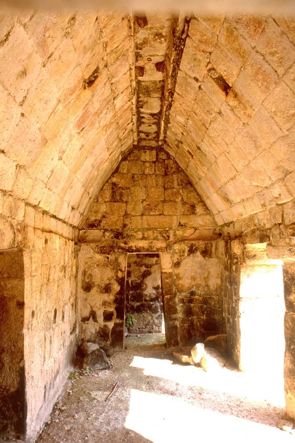 Interior of same room, looking through same narrow end door to room with staircase; visible beam holes near top.       Jan. 2003 (24mm lens)