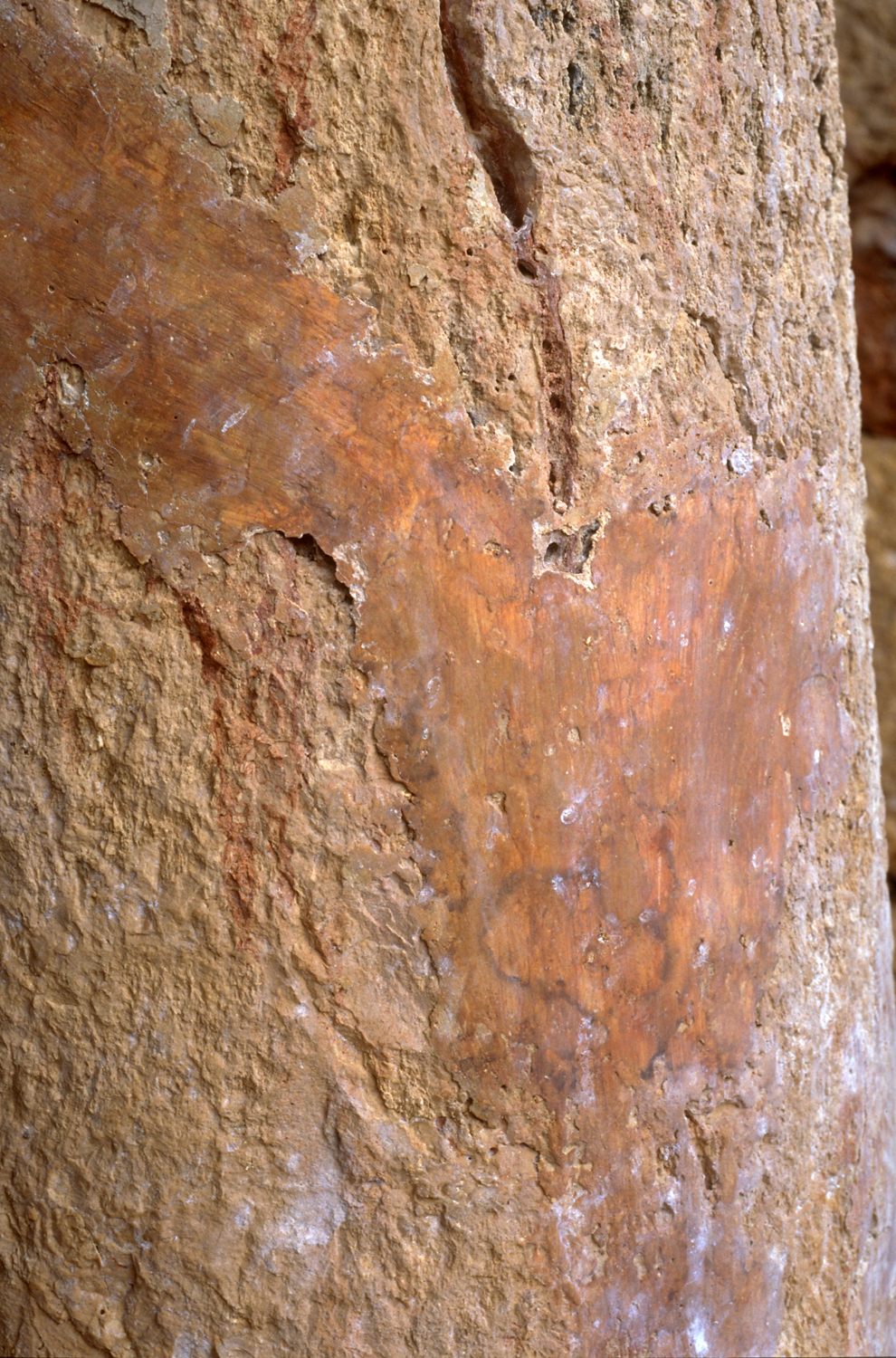 Same column; showing surviving thin coat of plaster, with red clay or paint, unusual to have survived on an exposed exterior.       Jan. 2003