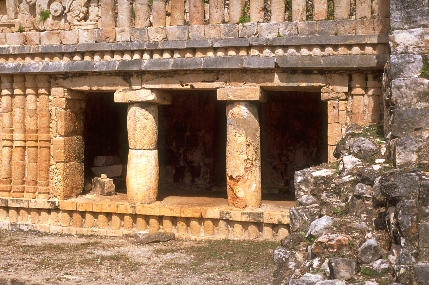 Two-columned doorway just to left of Grand Staircase: round columns with square capitals; medial and base moldings, both with plain colonnettes, but different heights.       Jan. 2002
