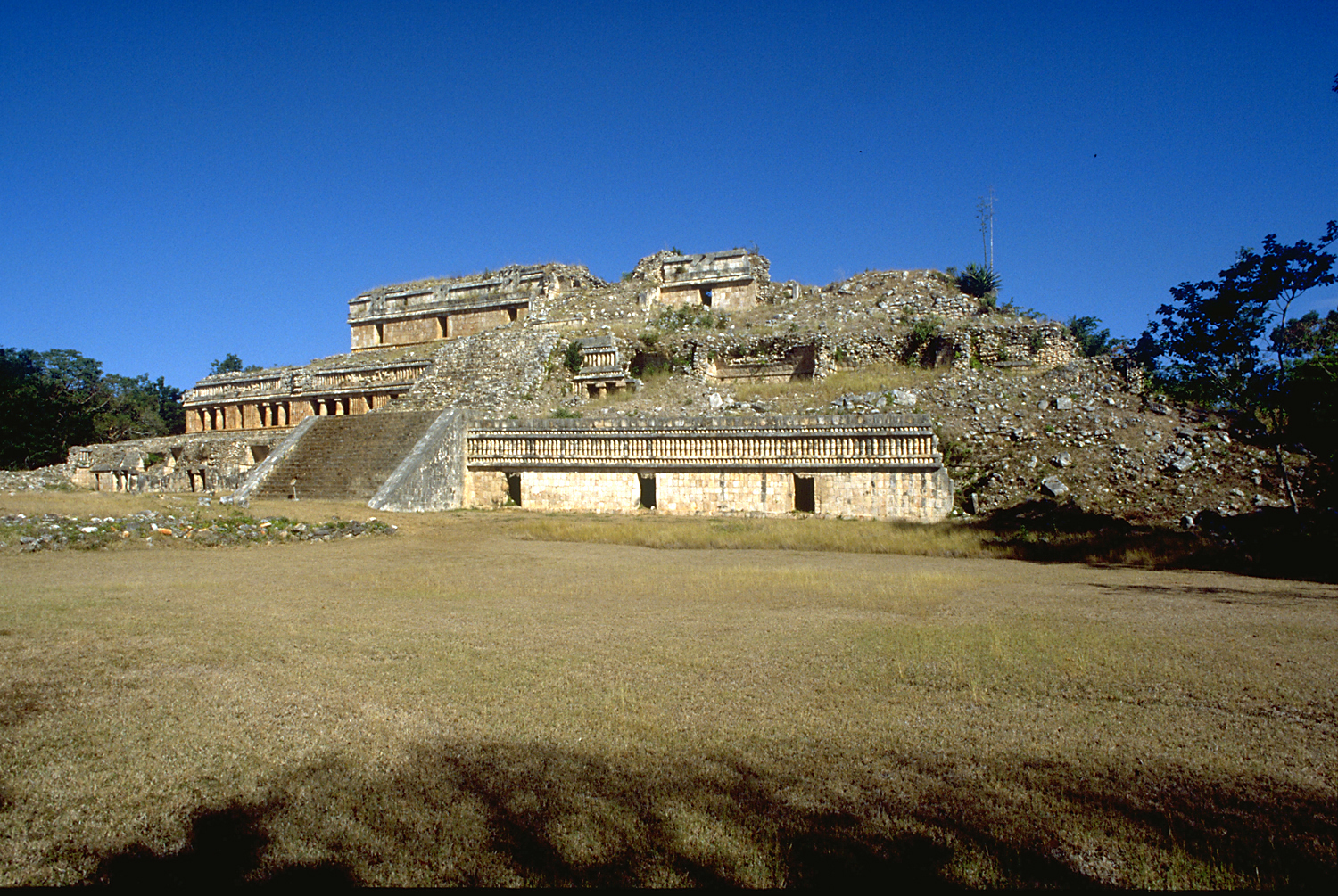 Front (south) facade from south-east, right half largely in ruins, only facade of lowest level restored.      Jan. 2003 (24mm lens)