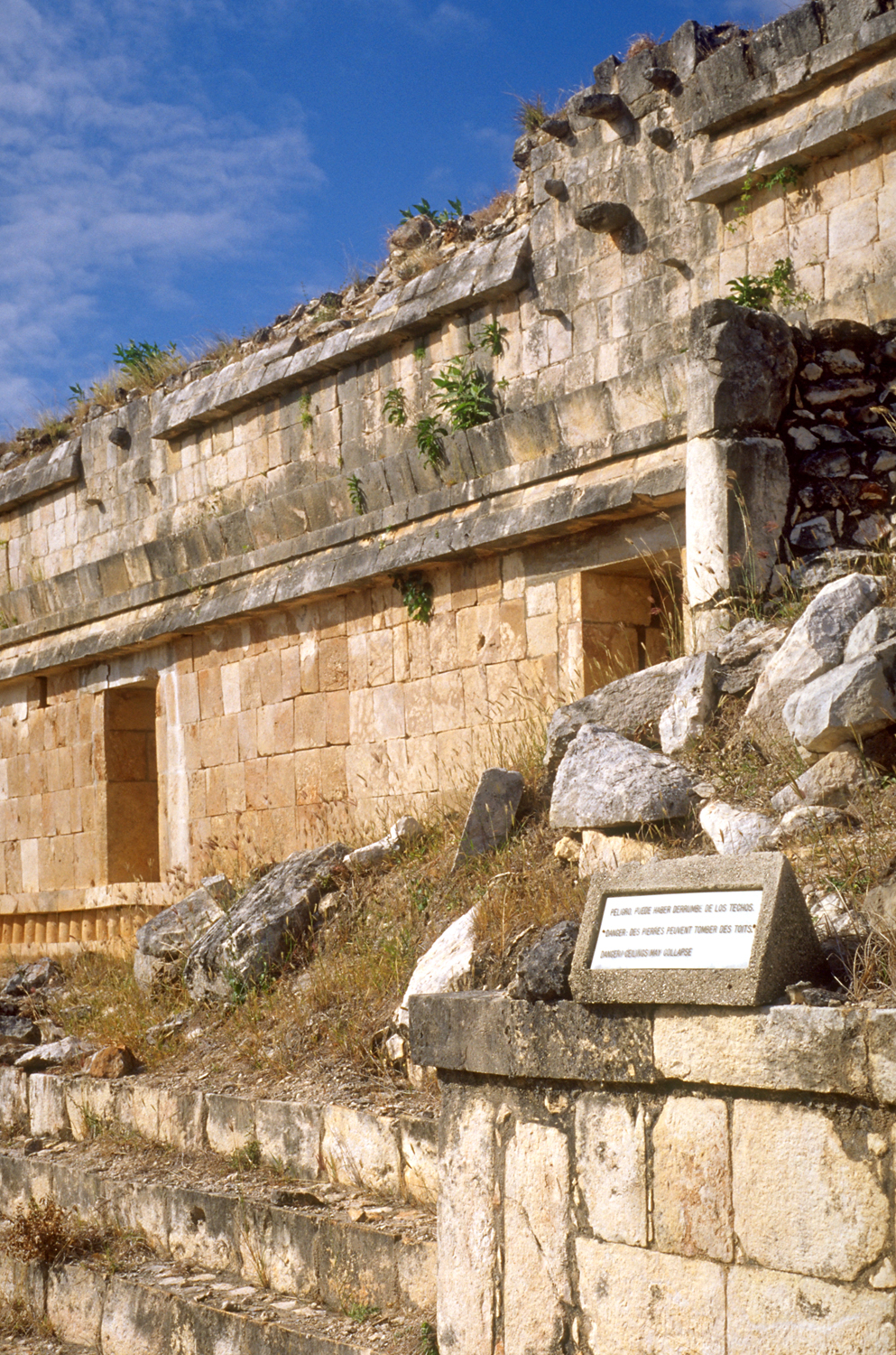 Warning sign near top of second level of staircase; wall of mid-level facade restored to show wall and tenons projecting above roof level.       Jan. 2001