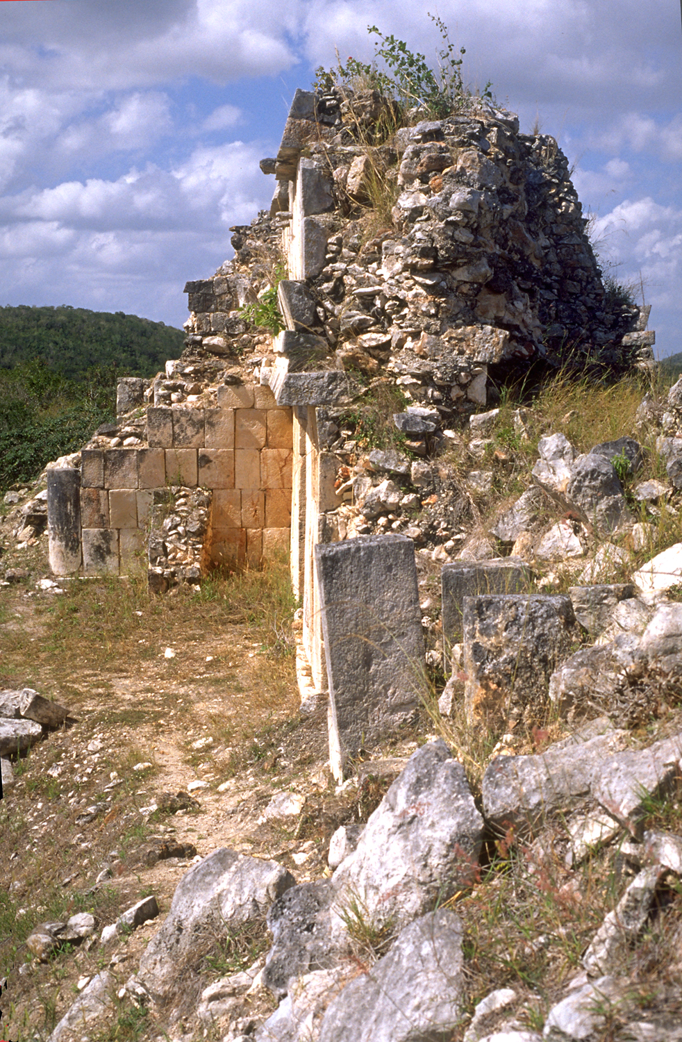 Looking west at remains of upper-level, right side; showing cross section of medial molding and other facing stones.     Jan. 2002