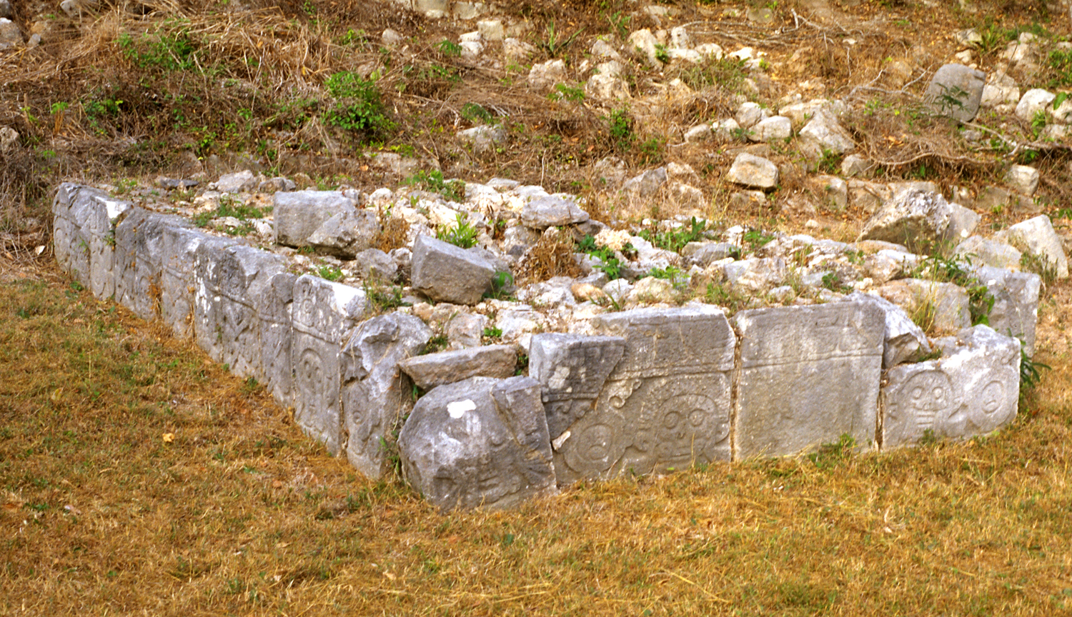 Skull platform farthest west in courtyard, showing west side and short south end; the north end of this platform is built into the terrace and thus has no stones. Jan. 2001