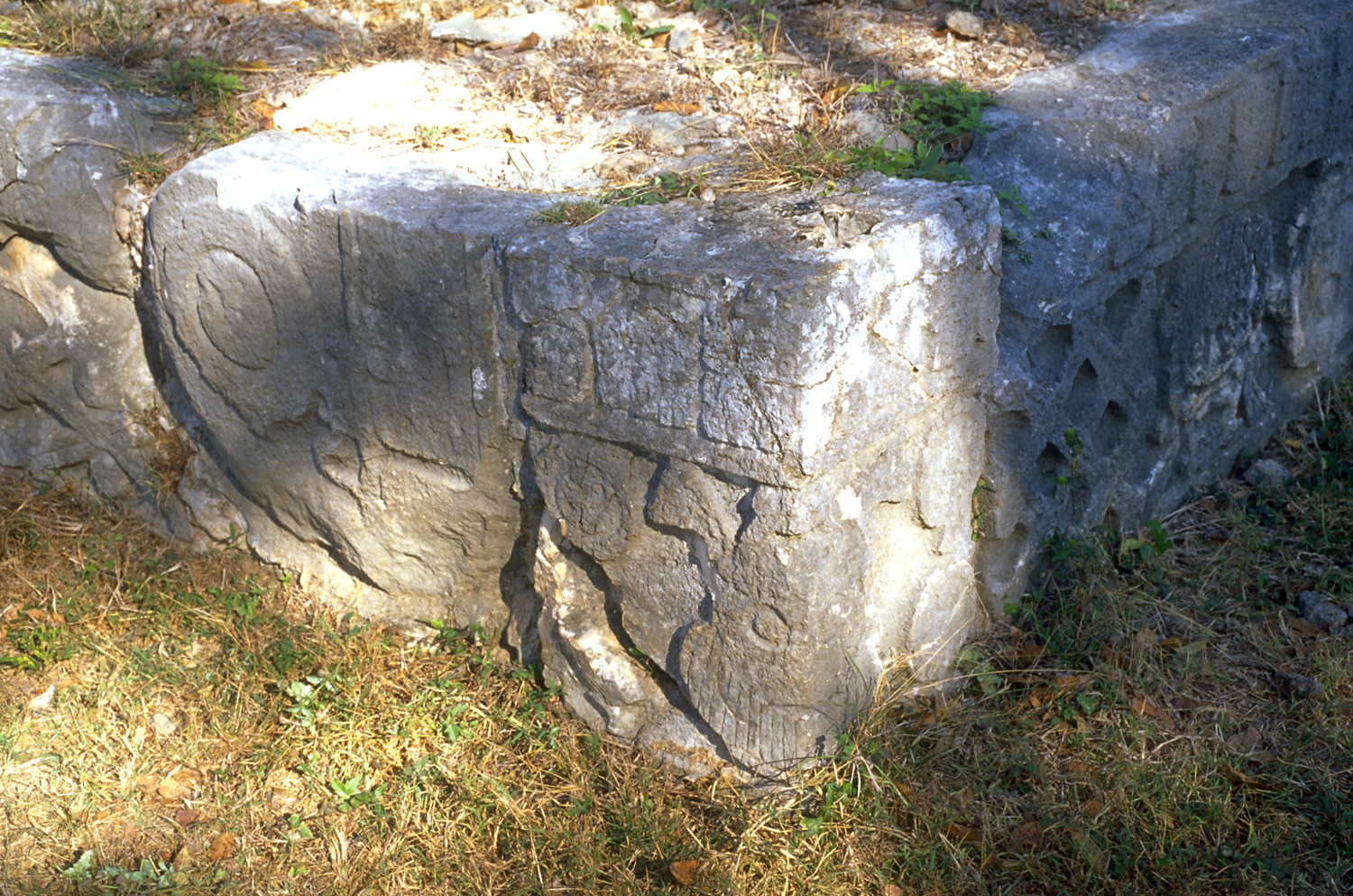 Skull platform farthest east in courtyard; southwest corner with skull upside down.