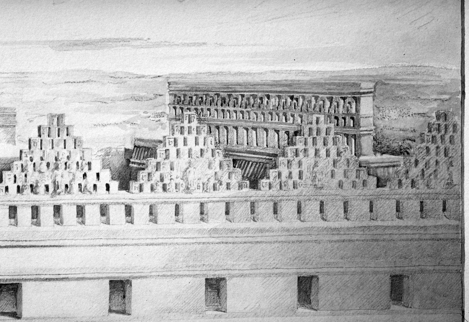 Detail of drawing at left. Watercolor reconstruction drawing by Tatiana Proskouriakoff, 1946; scanned from 35mm slide of the original watercolor drawing. Reproduced Courtesy of the Peabody Museum of Archaeology and Ethnology, Harvard University.