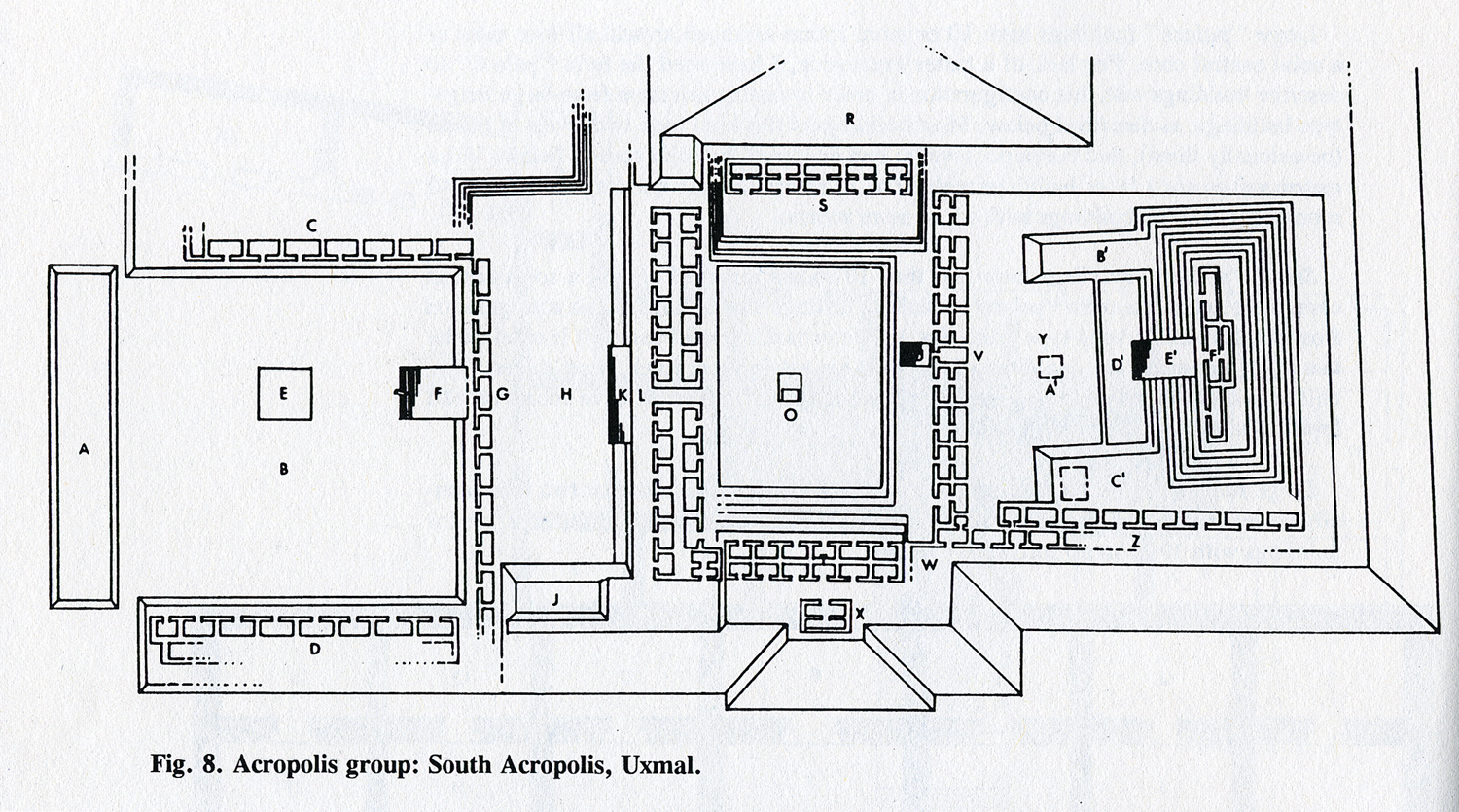 Scanned from George F. Andrews, Pyramids and Palace, Monsters and Masks; Vol. 1, Architecture of the Puuc Regions and the Northern Plains Area, 1995 (p. 218). Reproduced with permission of Labyrinthos, publishers, 1995.