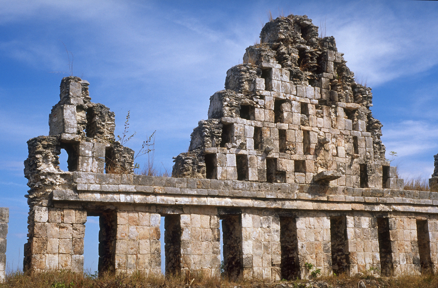 2nd (largely collapsed) and 3rd gable-shaped sections, west-to-east; showing projecting tenon which presumably originally held stucco figure. Jan. 2001