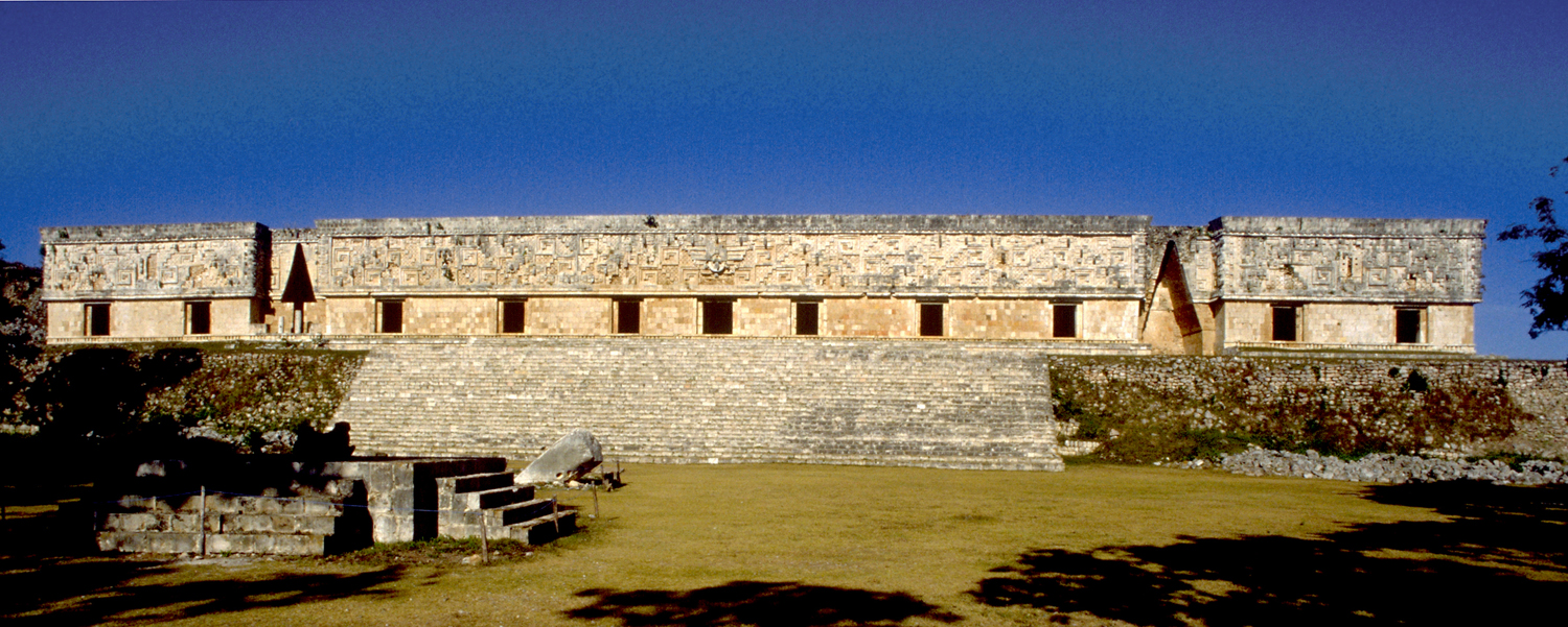 Front (east) facade; this frieze is the largest, most impressive example of Maya architectural sculpture, composed of over 15,000 mosaic pieces of carved stone, complexly but coherently organized. Jan. 2003 (24mm lens)