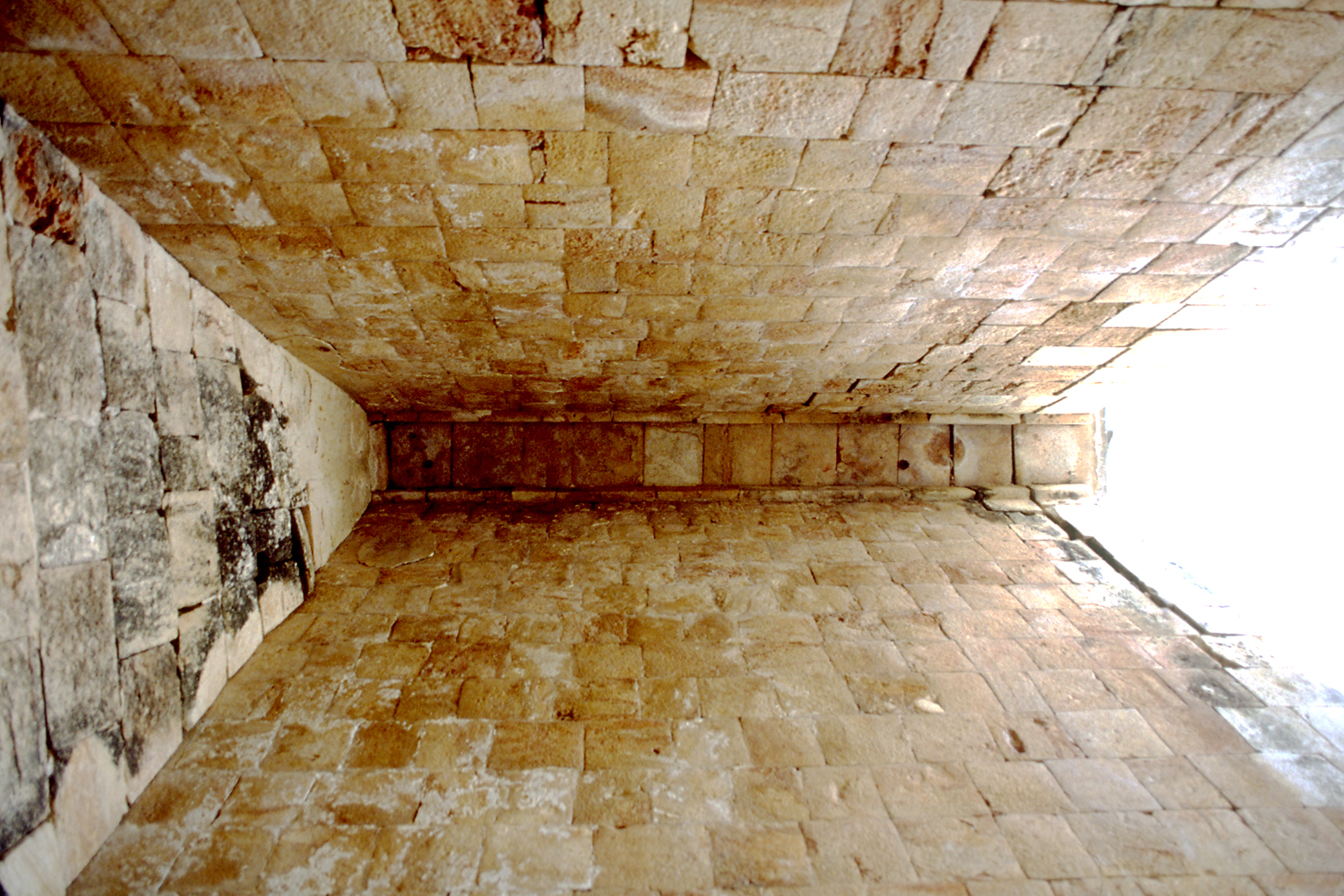 Underside of vaulted passageway, showing added transverse wall at left, at top the straight lines of slightly projecting slabs and wide, strong capstones. Jan. 2003 (24mm lens)