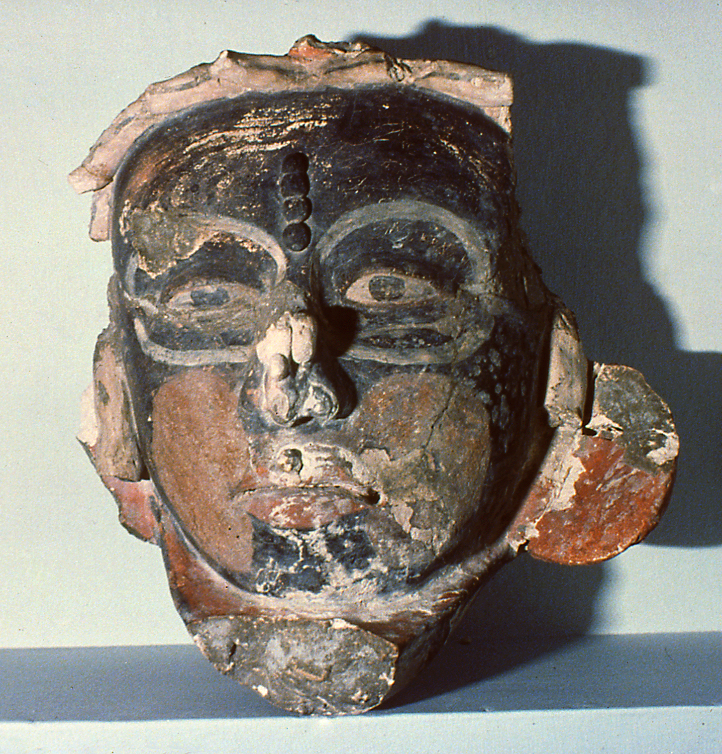 Painted stucco head found in room of Governor's Palace Scanned from original 35mm slide in Pre-Columbian Collection, Dumbarton Oaks; Reproduced Courtesy of the Peabody Museum of Archaeology and Ethnology, Harvard University.