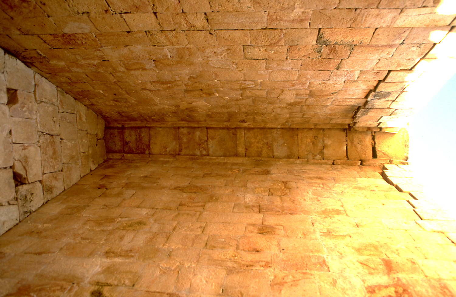 Underside of north vaulted passageway, showing straight lines of slightly projecting slabs and wide, strong capstone. Jan. 2003 (24mm lens)
