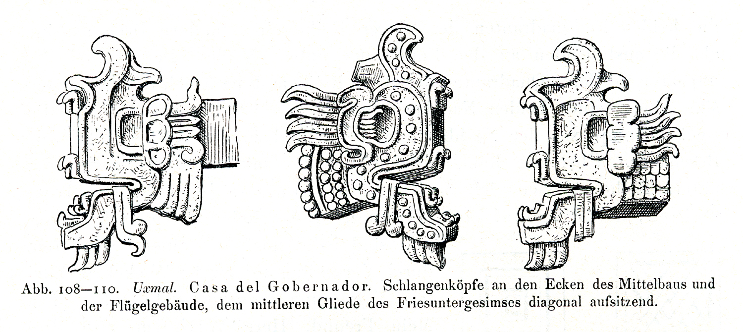 Scanned from Eduard Seler, “Die Ruinen von Uxmal”, 1917 (fig. 108-110); print closely based on Seler’s on-site drawings.