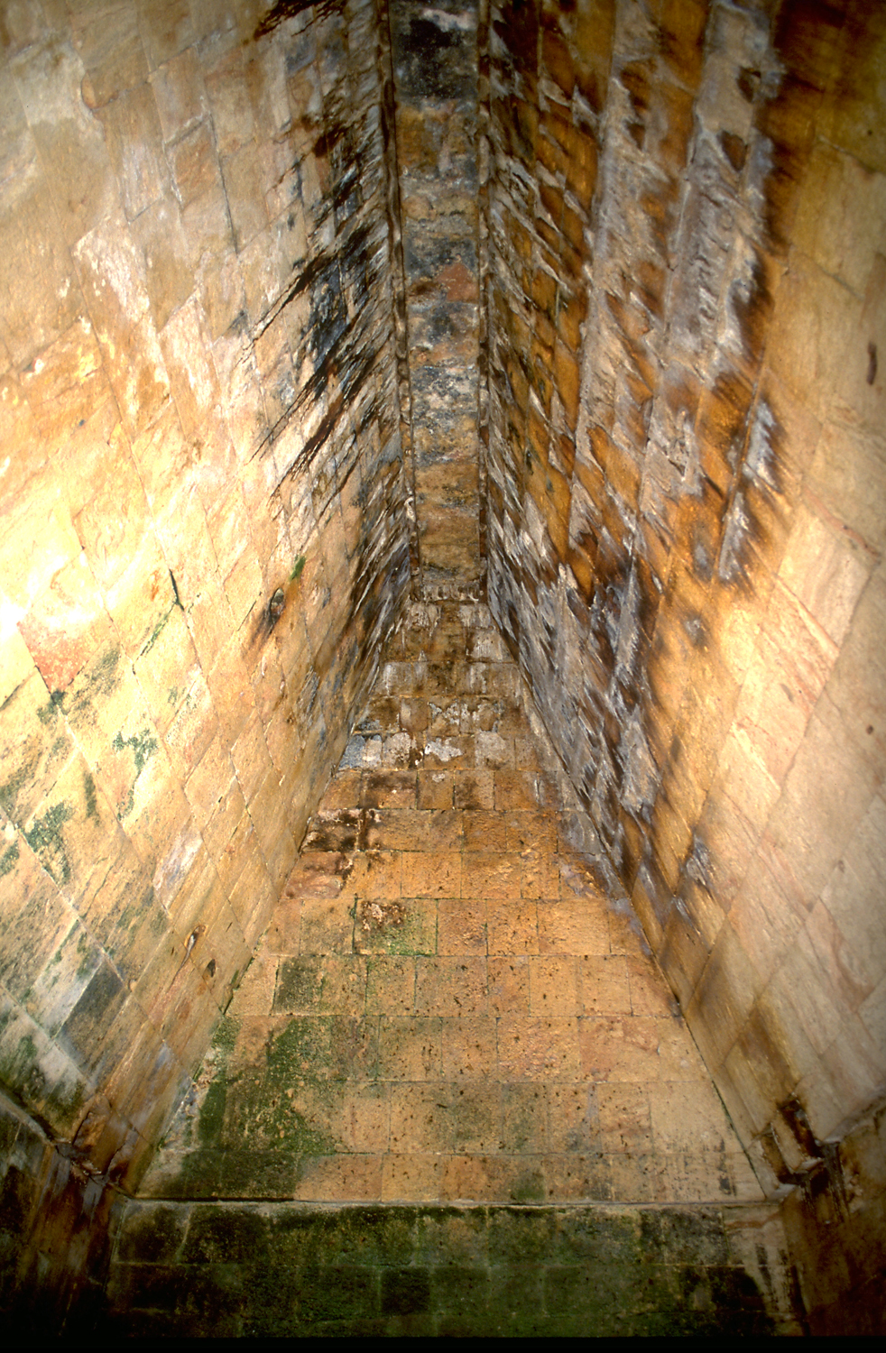 Detail of photo at left, showing sockets for two cross-beams at bottom of each side of vault