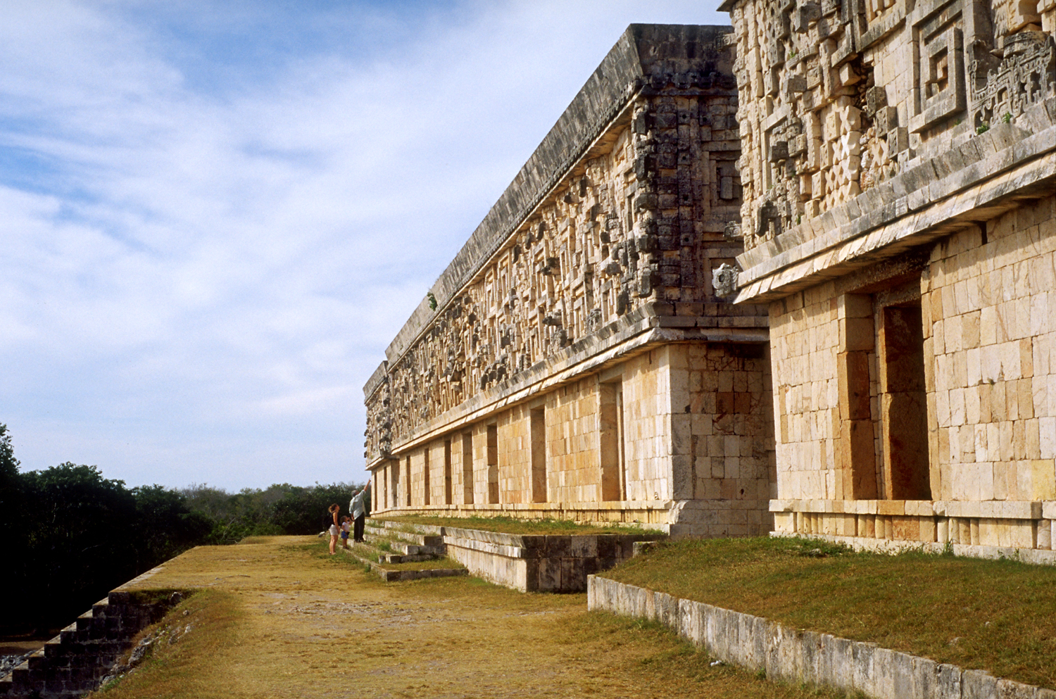 Looking southwest along front (east) facade; showing break in Building Platform at the entrance to the transverse vaulted passageway.