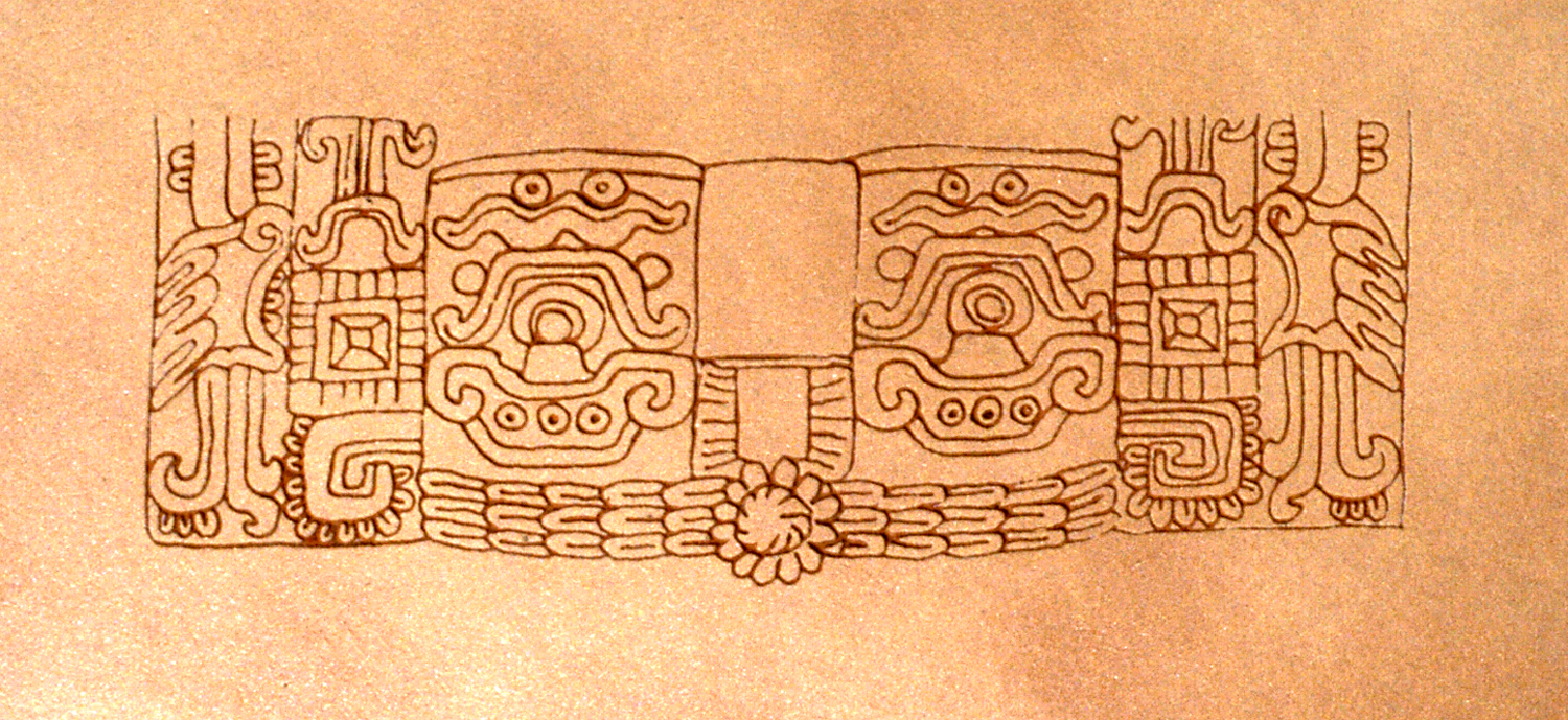Detail of plaque above; showing typical mask, here accidentally shown upside down.